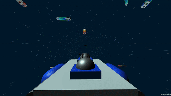Instead, I went with going a more familiar route for myself and go with starship mechanics, as my previous work with Global Game Jam would mean that I already had some scripting and particle effects already solved, and a simple aesthetic I could match, even though I was creating new assets. Knowing how game typically put you in the position of flying the ship, I chose to limit the player's control to a single turret, like the guns on the Millennium Falcon. Thus, the player could control their own actions, but could not dictate the path or position of the ship. I envisioned the game as a massive space battle between two warring fractions, with dozens of ships flying around each other while the player tried to do their part to keep their own ship alive, unable to do more than point and shoot.